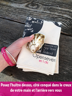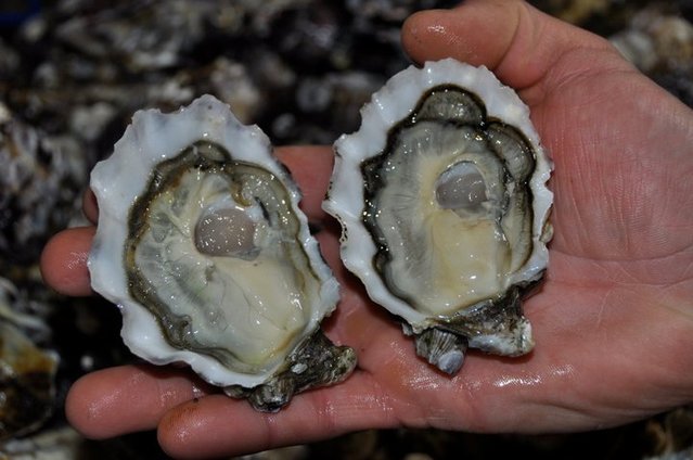 生蚝突出的一面贴着手掌心。